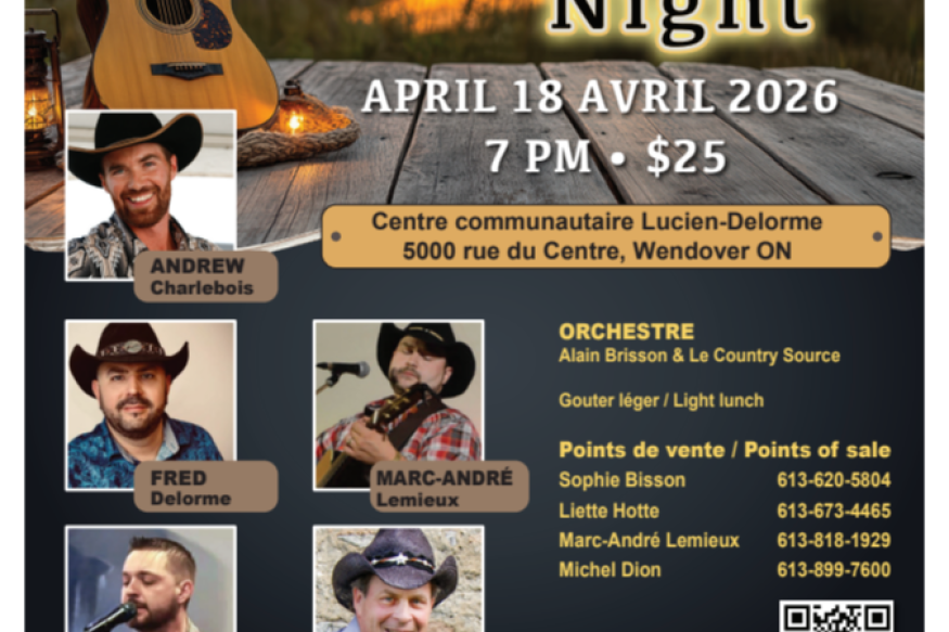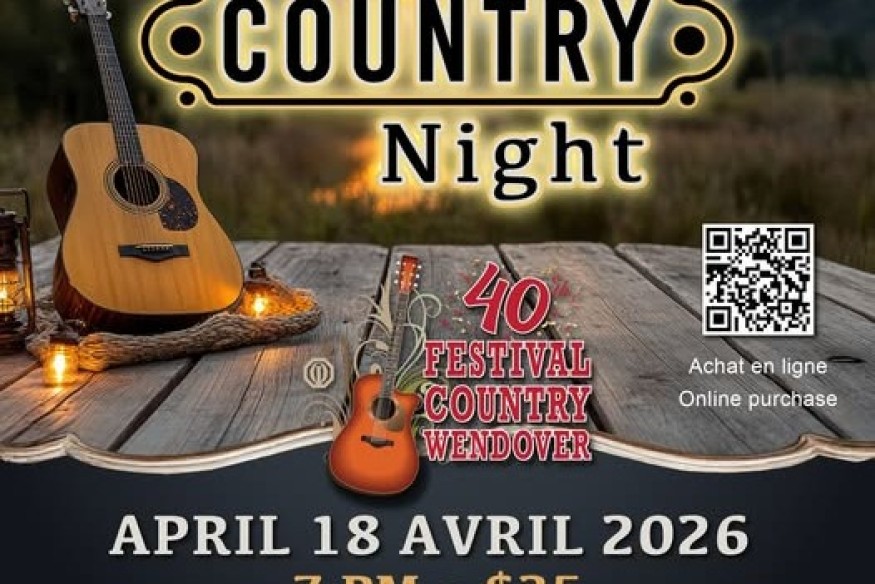 Venez nous joindre à notre soirée country annuel qui se déroulera le samedi 18 avril 2026, présenter par le Club Optimiste de Wendover. Les portes ouvreront à 18h30 pour l'événement. https://events.frontdoor.plus/event/1783 ...