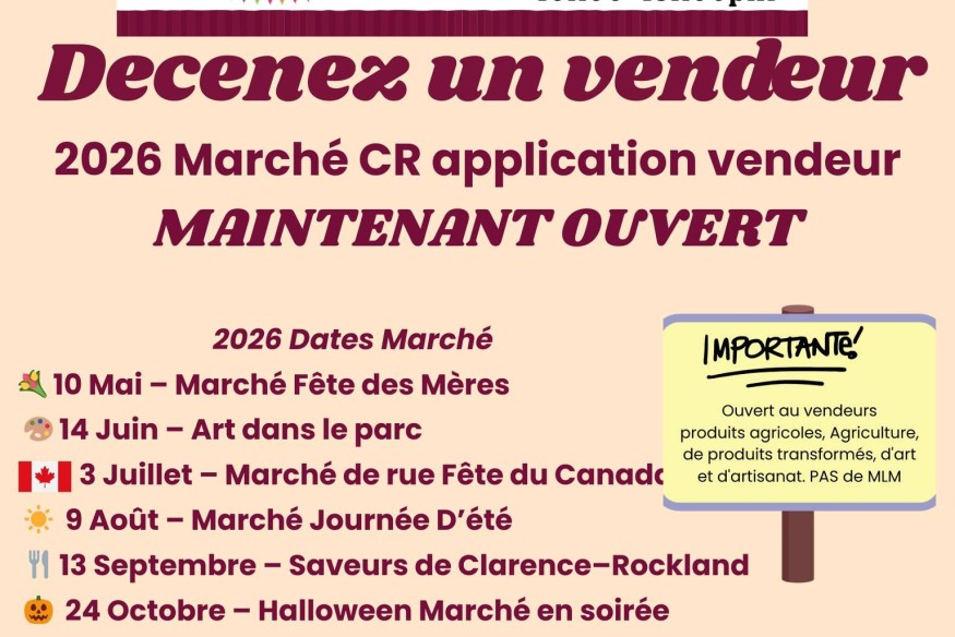 LES DATES DU MARCHÉ CR 2026 SONT ARRIVÉES ! Nous sommes très heureux d’annoncer les journées thématiques du marché pour la saison 2026 — et croyez-nous, vous ne voudrez en manquer aucune. Dates du marché 202613 septembre – Saveurs de Clarence–Rockland24 octobre – Marché de nuit d’Halloween Chaque date mettra en vedette d’incroyables vendeurs locaux, de la nourrit...