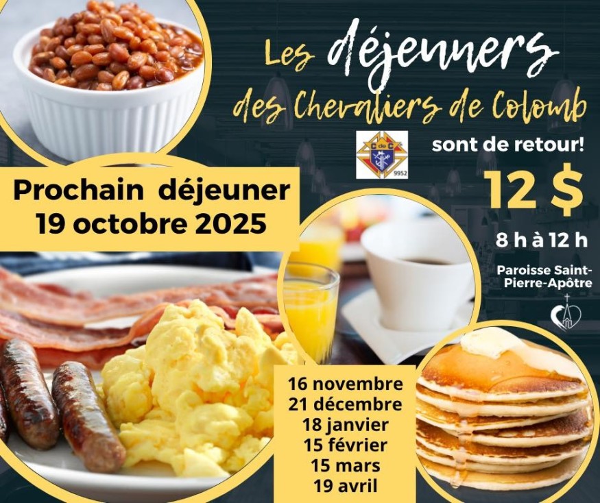 Bonne nouvelle! Les déjeuners mensuels des Chevaliers de Colomb 9952 reprennent dès le dimanche 19 octobre, de 8 h à midi, à la salle communautaire Denise-Joanette (sous-sol de l'église). Venez partager un bon repas en famille ou entre amis pour seulement 12 $ par personne. Voici les dates à retenir : 19 octobre, 16 novembre, 21 décembre, 18 janvier, 15 février, 15 mars et 19 avril. Tous les profits de ces déjeuners seront remis aux organismes de la région. Une belle façon de les soutenir en renforçant les liens communautaires https://www.facebook.com/share/p/1CkqXWsMRd/