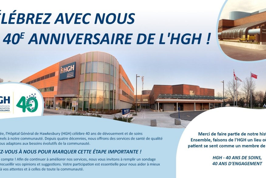 L’Hôpital général de Hawkesbury a célébré hier ses 40 ans d’existence. L’hôpital a ouvert ses portes à ses premiers patients le 27 mai 1984. L'équipe de l’établissement a d’ailleurs profité de l’occasion pour lancer un sondage destiné à recueillir les opinions et les suggestions de la communauté afin d’améliorer les soins prodigués. Le sondage est disponible via le site Internet de l’Hôpital. L’HGH est un hôpital régional bilingue offrant une gamme complète de programmes et de services de santé......