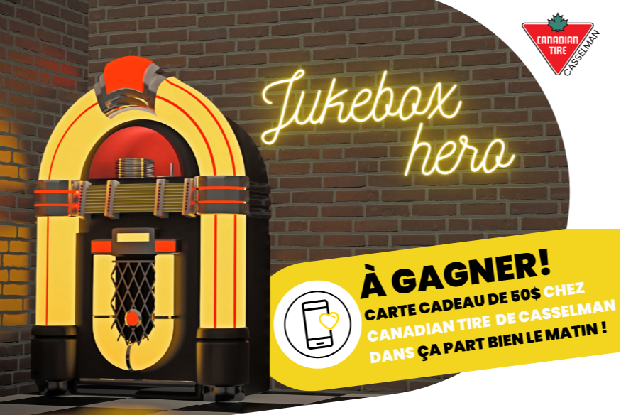 Dans Ça part bien le matin à 8 h 15, Mathieu et Elise s’affrontent au Jukebox Hero Mathieu choisit une chanson, Elise en propose une autre… et ce sont les auditeurs qui décident laquelle jouera! Pour voter, il suffit de texter la station au 1-877-921-0921 avec le choix de chanson préféré. Chaque vendredi, parmi tous les participants de la semaine, un auditeur court la chance de gagner une carte-cadeau de 50 $ chez Canadian Tire de Casselman. Le tirage a lieu en direct pendant le Juke Box Hero du vendredi matin. À l’écoute, à vos textos… et que la meilleure chanson gagne! ...
