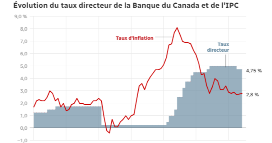 Un rapport de Statistique Canada montre que l’indice des prix à la consommation sur une base annuelle s’établissait à 2,7 % le mois dernier, un ralentissement de 0,2 % par rapport aux données de mai. Après avoir grimpé à 2,9 % en mai, l’inflation est repassée à 2,7% en juin, une des raisons principales étant que le prix de l’essence a connu une augmentation moins marquée. Les prix du carburant à la pompe ont progressé de 0,4% en juin après avoir progressé de 5,6% en mai. L’inflation sur une base annuelle a ralenti dans six provinces au cours des derniers mois. Outre l’essence, une baisse de 1,8 % d’une année à l’autre du prix des biens durables comme les électroménagers, les meubles, les voitures ont contribué au ralentissement de l’inflation le mois dernier. La Banque du Canada, qui a consenti en juin a une baisse de son taux directeur à 4,75 %, doit se prononcer de nouveau le 24 juillet sur la suite des choses.