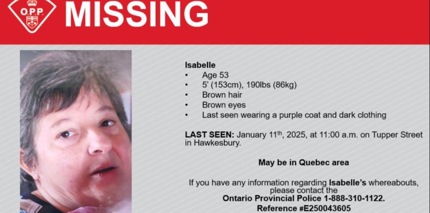 La Police provinciale de l’Ontario du détachement de Hawkesbury est à la recherche d’Isabelle Beaulne, portée disparue. La femme de 53 ans mesure 5 pieds, pèse environ 190 lbs, a des yeux et cheveux bruns. Elle a été vue pour la dernière fois le 11 janvier vers 11 h, sur la rue Tupper à Hawkesbury, portant un manteau brun et des vêtements foncés. Elle pourrait se trouver dans la région du Québec. Toute information doit être signalée à la PPO.