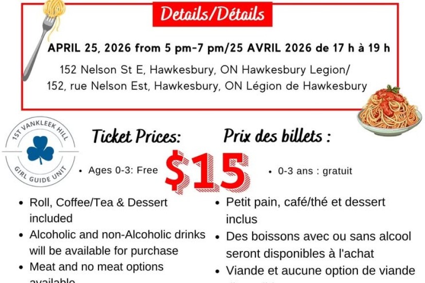 Il est temps de manger des pâtes avec un but ! Dégustez une assiette de spaghetti (options avec et sans viande), un petit pain, avec dessert, café/thé inclus à la Légion royale canadienne à Hawkesbury. Deux heures assises 17h et 18h. Tarifs des billets : 15 $0-3 ans : gratuit Facebook ...