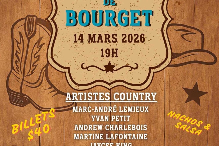 Bourget Stampede Taureau mécanique • Groupes country en direct En selle, Bourget! Le Bourget Stampede débarque en ville pour une soirée inoubliable de musique country, de bonne bouffe et de pur plaisir. Date : Samedi 14 mars 2026Heure : 19 hLieu : Centre communautaire de Bourget19, rue Lavigne, Bourget (Ontario) Spectacles en direct avec : Marc-André Lemieux Yva...
