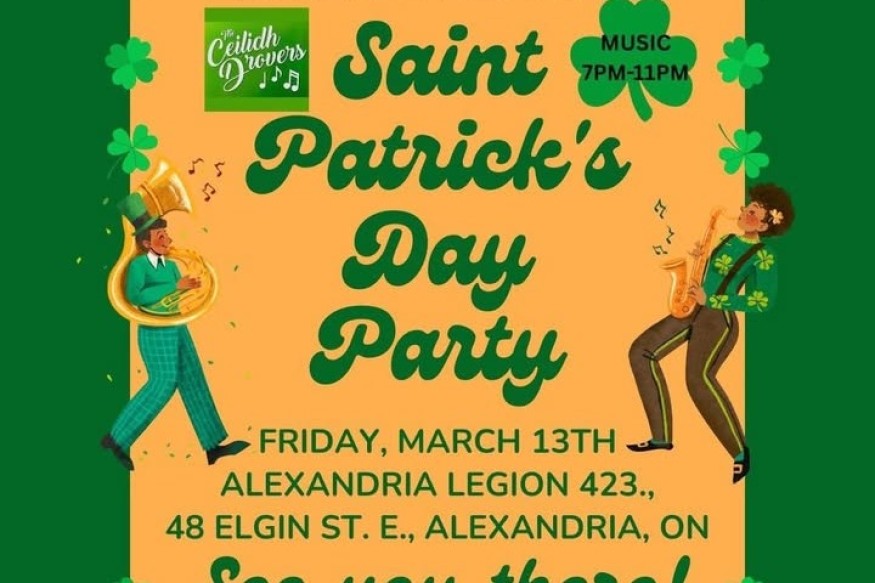 Fête de la Saint-Patrick le vendredi 13 mars de 19 h à 23 h à la Légion d’Alexandria 423, située au 48, rue Elgin Est, Alexandria (Ontario). Sortez vos vêtements verts et venez célébrer avec nous. Entrée gratuite. Tout le monde est le bienvenu. Facebook ...