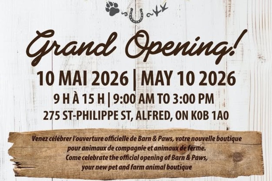 Grande Ouverture de Barn & Paws à Alfred! C’est avec une immense fierté que nous vous invitons à célébrer l’ouverture officielle de Barn & Paws, votre nouvelle boutique dédiée aux animaux de compagnie et aux animaux de ferme Dimanche 10 mai 2026 De 9h00 à 15h00275 rue St-Philippe, Alfred, ON Après plusieurs semaines de travail et de rénovations, nous sommes enfin prêtes à...