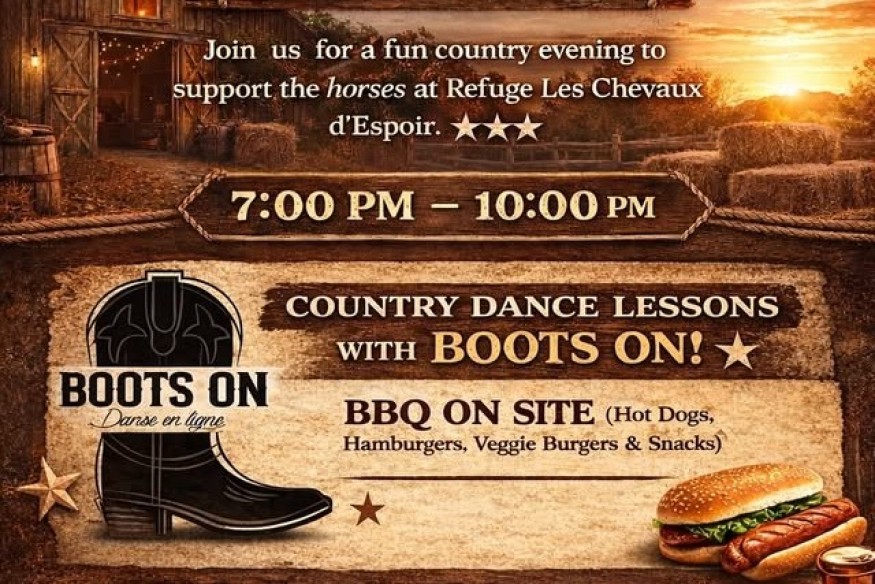Soirée country – Levée de fonds au refuge 23 mai 2026270 Pattee Road, Hawkesbury Venez passer une magnifique soirée country au Refuge Les Chevaux d’Espoir dans le cadre d’une levée de fonds au profit des chevaux du refuge. De 19 h à 22 h, Boots On sera sur place pour donner des cours de danse country et vous faire danser toute la soirée. Pour ceux qui préfèrent si...
