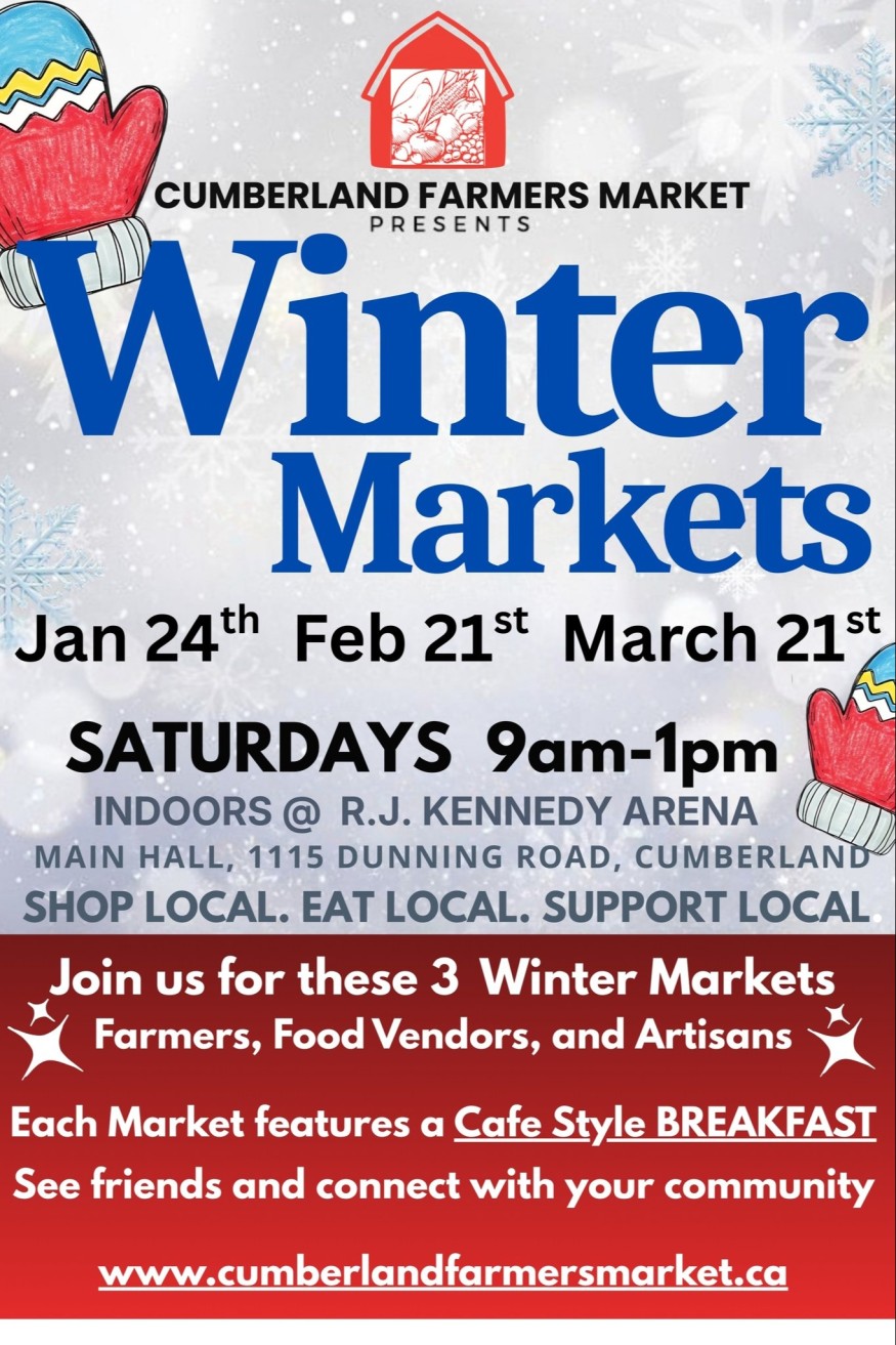 Marché d’hiver — samedi 21 mars 20269 h à 13 hSalle principale RJ Kennedy — 1115, chemin Dunning, Cumberland Joignez-vous à nous pour notre marché d’hiver de mars et profitez d’une expérience chaleureuse et accueillante, pensée pour le confort et le plaisir de se rassembler en communauté. Découvrez une belle sélection de producteurs agricoles et d’artisans locaux offrant des produits frais et locaux, des créations faites à la main, des produits de boulangerie et des coups de cœur de saison. C’est l’occasion idéale d’encourager les petites entreprises tout en profitant d’un marché intérieur détendu. À quoi vous attendre :• Stationnement gratuit• Marché intérieur, au chaud et à l’abri des intempéries• Guichet automatique sur place• Déjeuner style café avec aire de places assises à l’intérieur• Producteurs et marchands locaux accueillants Que ce soit pour déjeuner, faire le plein de produits locaux ou passer un moment agréable entre amis ou en famille, le Marché d’hiver est une excellente façon d’illuminer une matinée de mars. Nous avons hâte de vous accueillir le 21 mars 2026, de 9 h à 13 h. Tout le monde est le bienvenu. https://www.facebook.com/cumberlandfarmersmarket