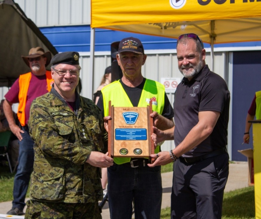 Mathieu et Etienne ont jasé avec Marc-André Périad, directeur des Services d'urgence de Prescott-Russell, qui a reçu une plaque honorifique de la part des organisateurs du 2804 CC Dice Run de Casselman.